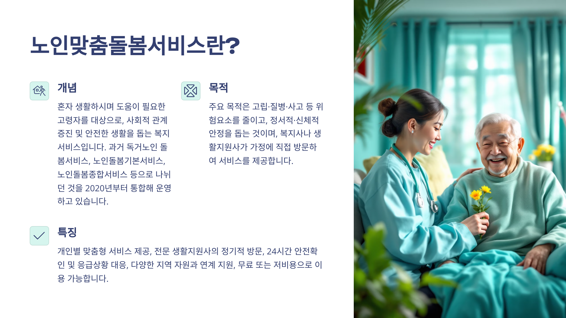 홀로 지내거나 일상생활이 불편한 어르신들이 늘어나면서, 정부는 이들을 위한 노인맞춤 돌봄 서비스를 전국적으로 확대해 시행하고 있습니다. 단순한 말벗 서비스부터 안부확인, 생활지원, 병원동행까지 제공되며, 경제적 상황과 관계없이 만 65세 이상 고령자 중 도움이 필요한 누구나 신청할 수 있습니다. 이 글에서는 노인맞춤 돌봄 서비스의 대상, 제공 내용, 신청 조건과 방법을 상세하게 안내드립니다.