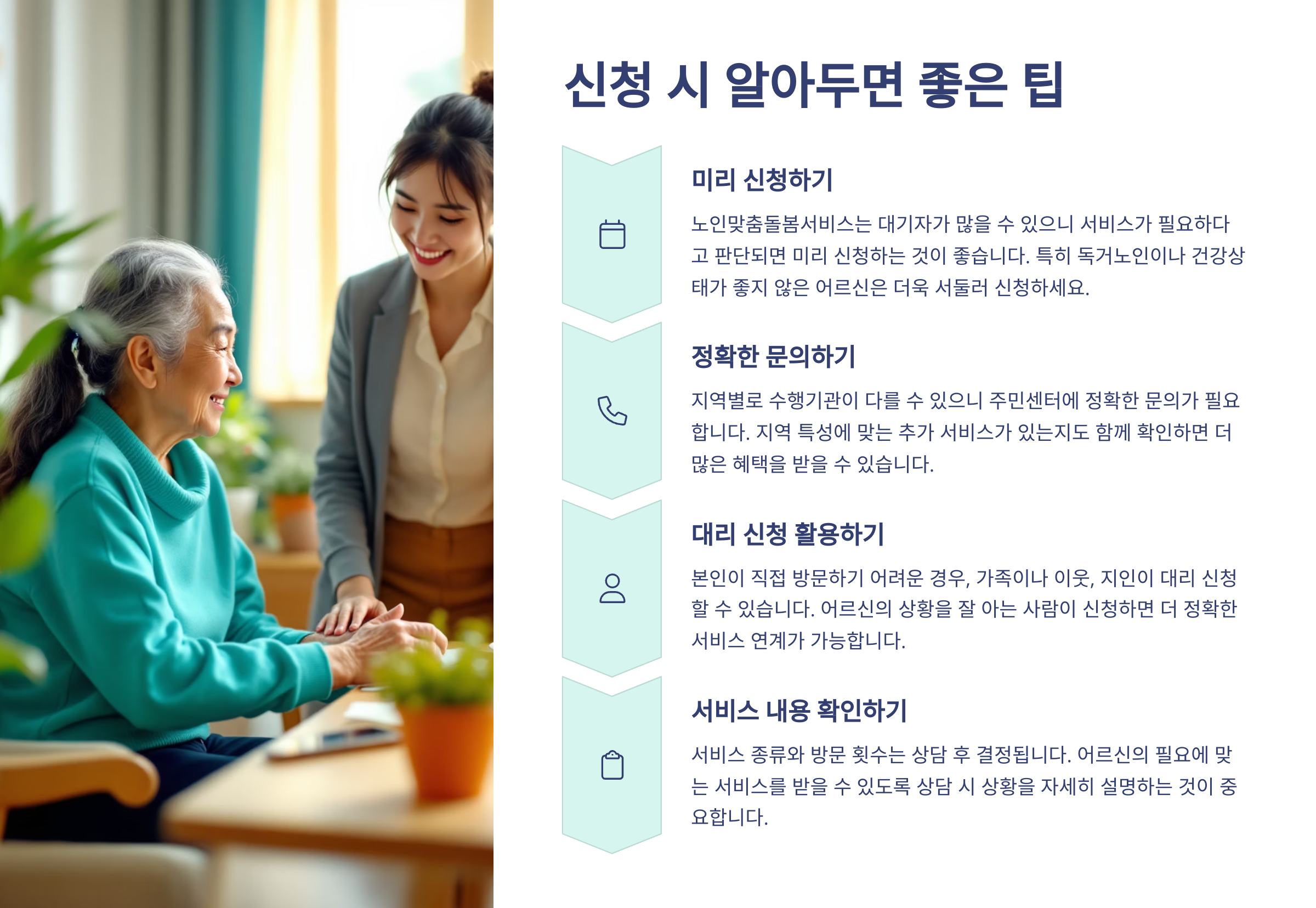 노인맞춤 돌봄 서비스는 주민센터 방문 또는 전화신청으로 간단히 접수할 수 있습니다. 대리 신청도 가능하므로 가족이나 이웃이 대신 신청해도 무방합니다.