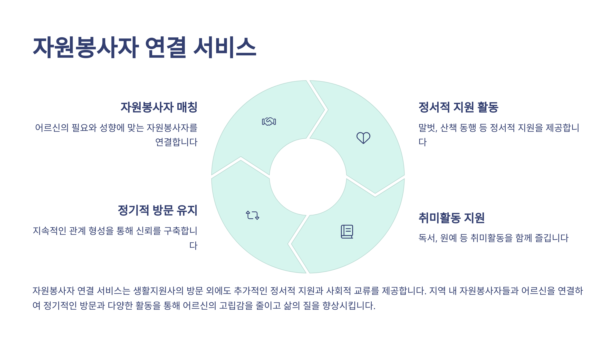 노인의 욕구와 환경에 따라 다음과 같은 서비스를 맞춤형으로 제공합니다. 필요에 따라 정기적 방문 또는 연계 지원으로 진행됩니다.