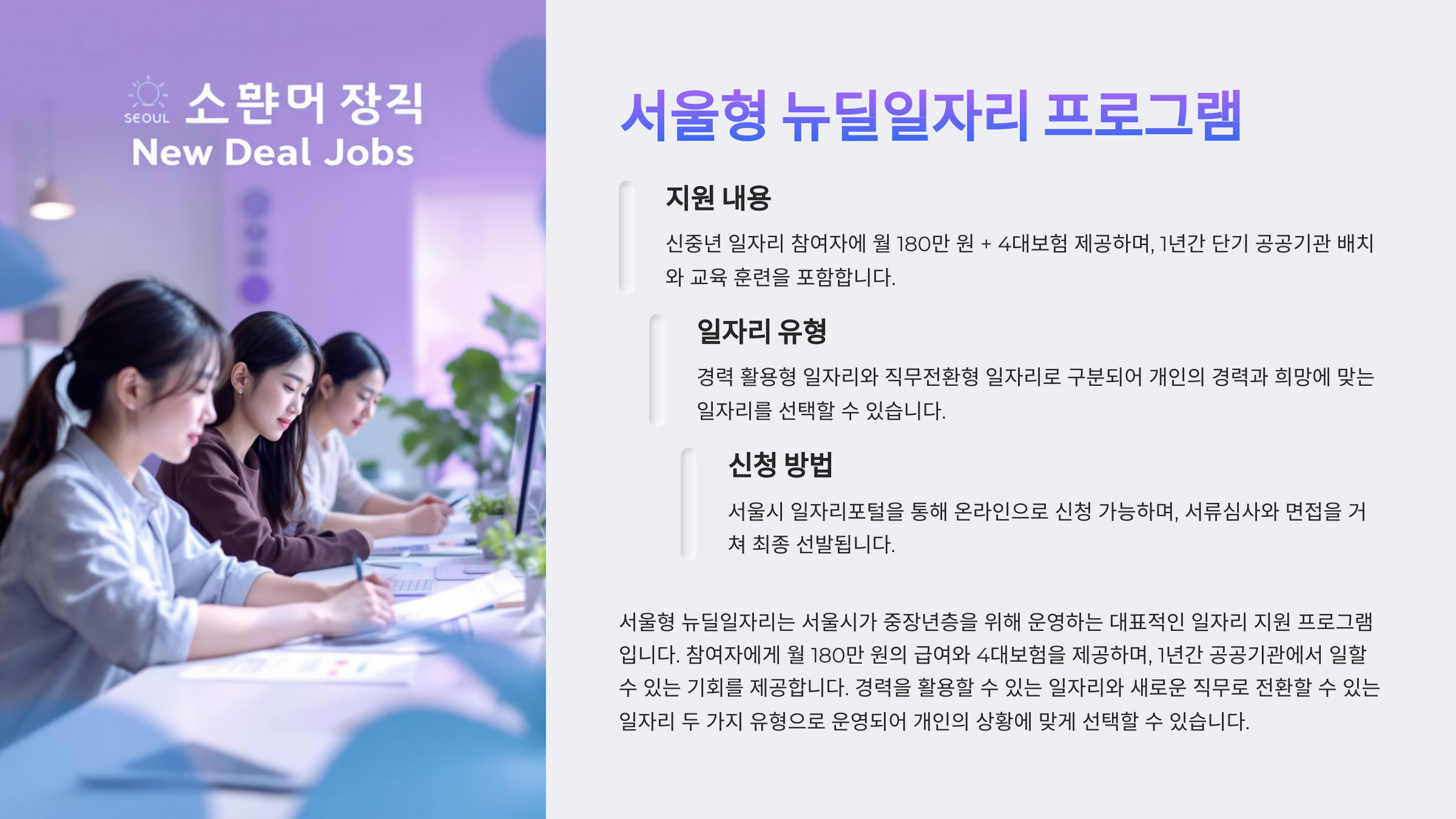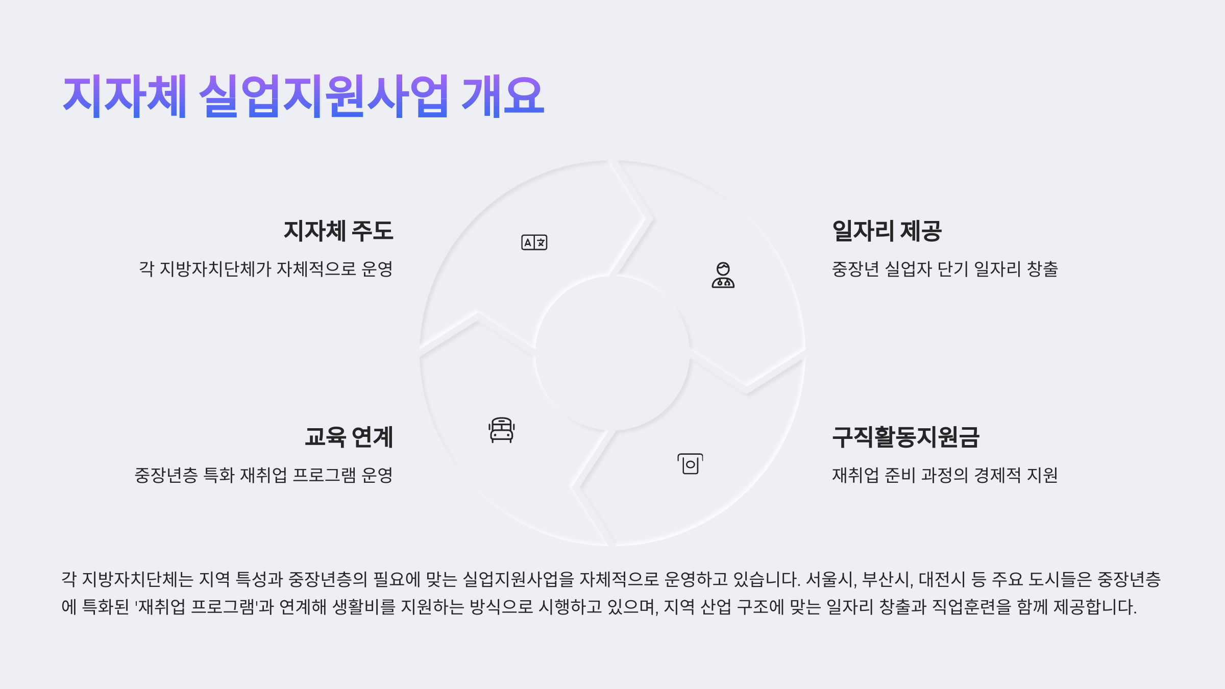 각 지방자치단체는 자체적으로 중장년 실업자 단기 일자리나 구직활동지원금을 운영 중입니다. 서울시, 부산시, 대전시 등은 중장년층에 특화된 '재취업 프로그램'과 연계해 생활비를 지원하는 방식으로 시행합니다.