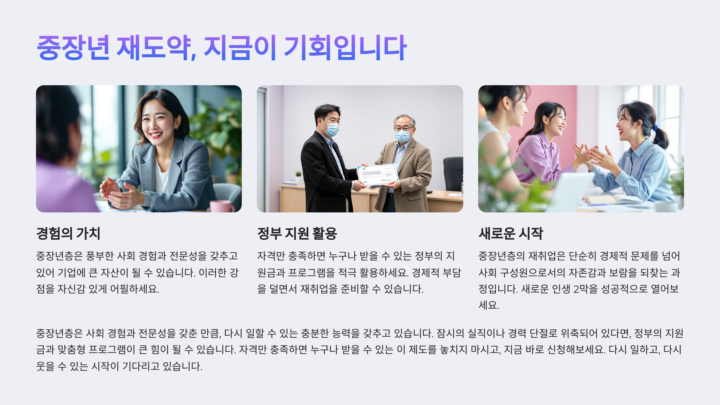 중장년층은 사회 경험과 전문성을 갖춘 만큼, 다시 일할 수 있는 충분한 능력을 갖추고 있습니다. 다만, 잠시의 실직이나 경력 단절로 위축되어 있는 경우, 정부의 지원금과 맞춤형 프로그램이 큰 힘이 될 수 있습니다.