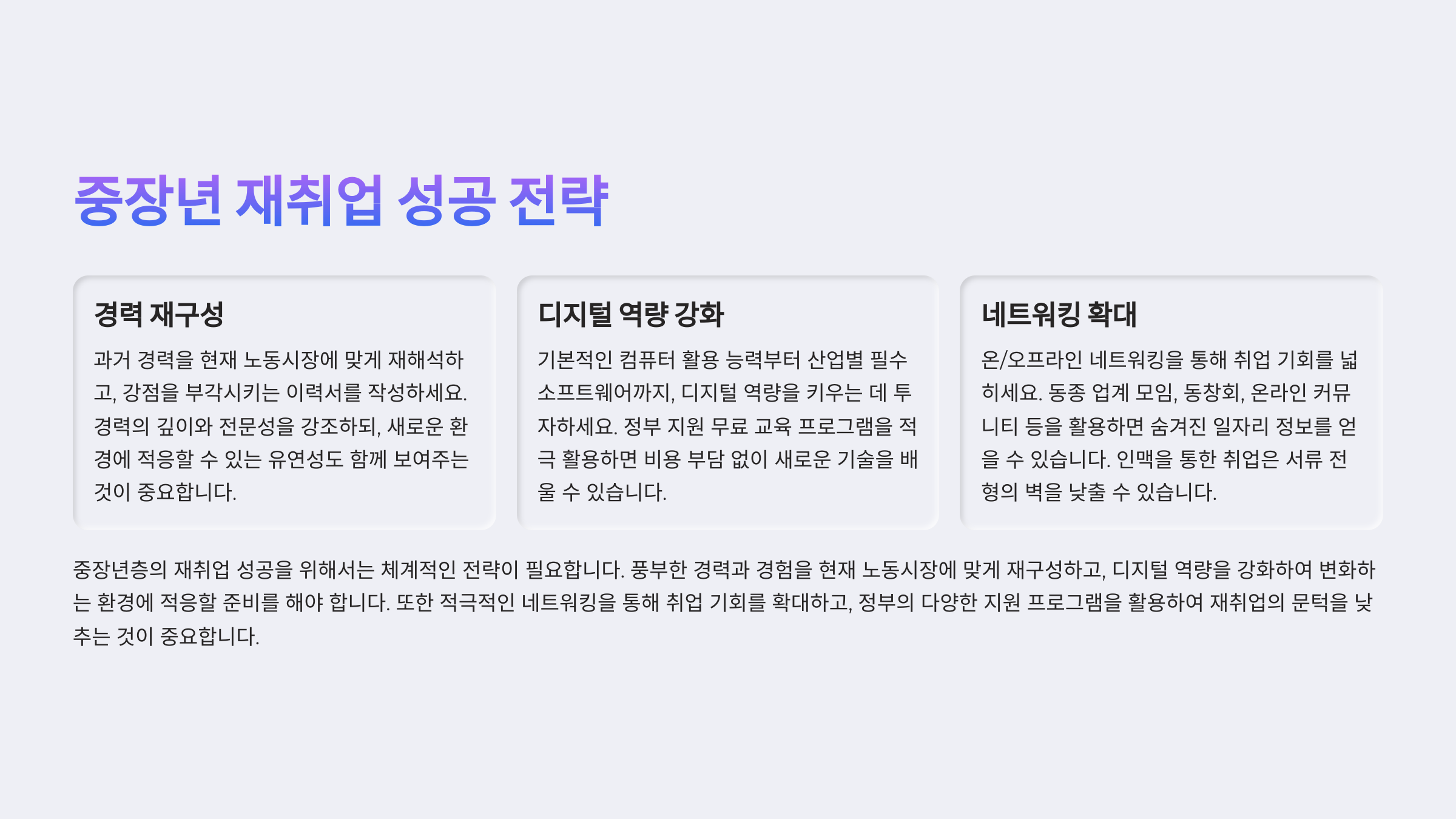 중장년층의 재취업은 단순히 경제적 문제를 넘어 사회 구성원으로서의 자존감과 보람을 되찾는 과정입니다. 정부와 지자체의 다양한 지원 프로그램을 적극 활용하여 새로운 인생 2막을 성공적으로 열어보시기 바랍니다.