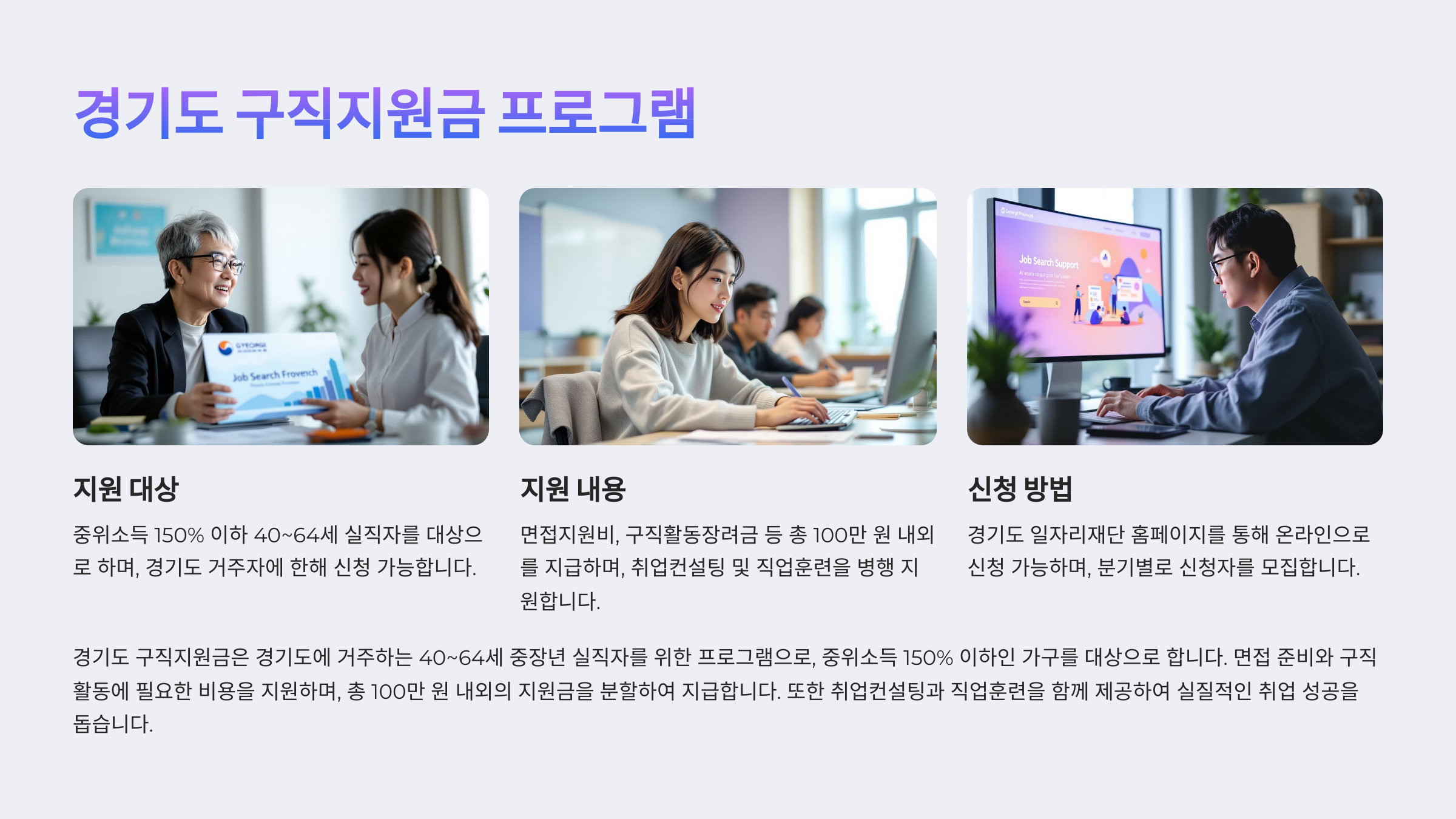 중장년 구직자 지원금은 40~60대 구직자 가운데 실직 이후 소득이 없는 상태에서 재취업을 준비하는 이들을 위해 제공됩니다. 주요 목적은 생활 안정을 도모하고, 취업 의욕을 고취시키는 데 있으며, 고용노동부와 지방자치단체, 고용센터가 연계해 다양한 형태로 지원하고 있습니다.