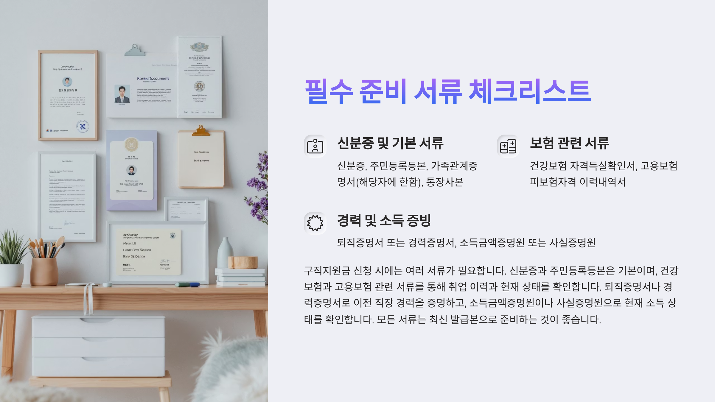 - 주민등록등본, 소득증빙서류, 퇴직확인서 등 제출 필요