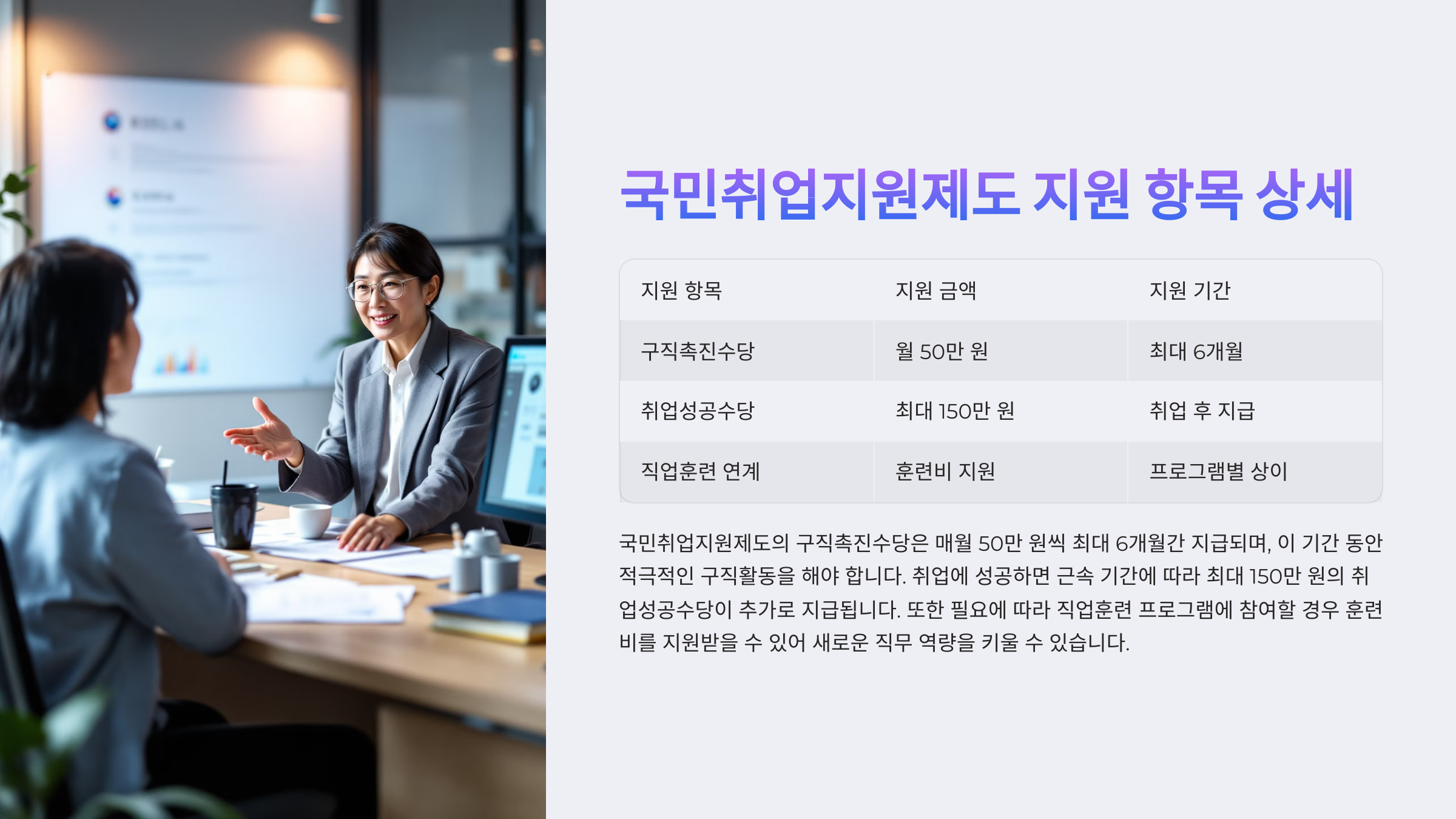 국민취업지원제도(1 유형)는 중장년 구직자에게 가장 보편적으로 제공되는 지원금 프로그램입니다. '한국형 실업부조'로 불리며, 구직활동을 하는 조건으로 매달 50만 원씩 6개월간 총 300만 원을 지원합니다.