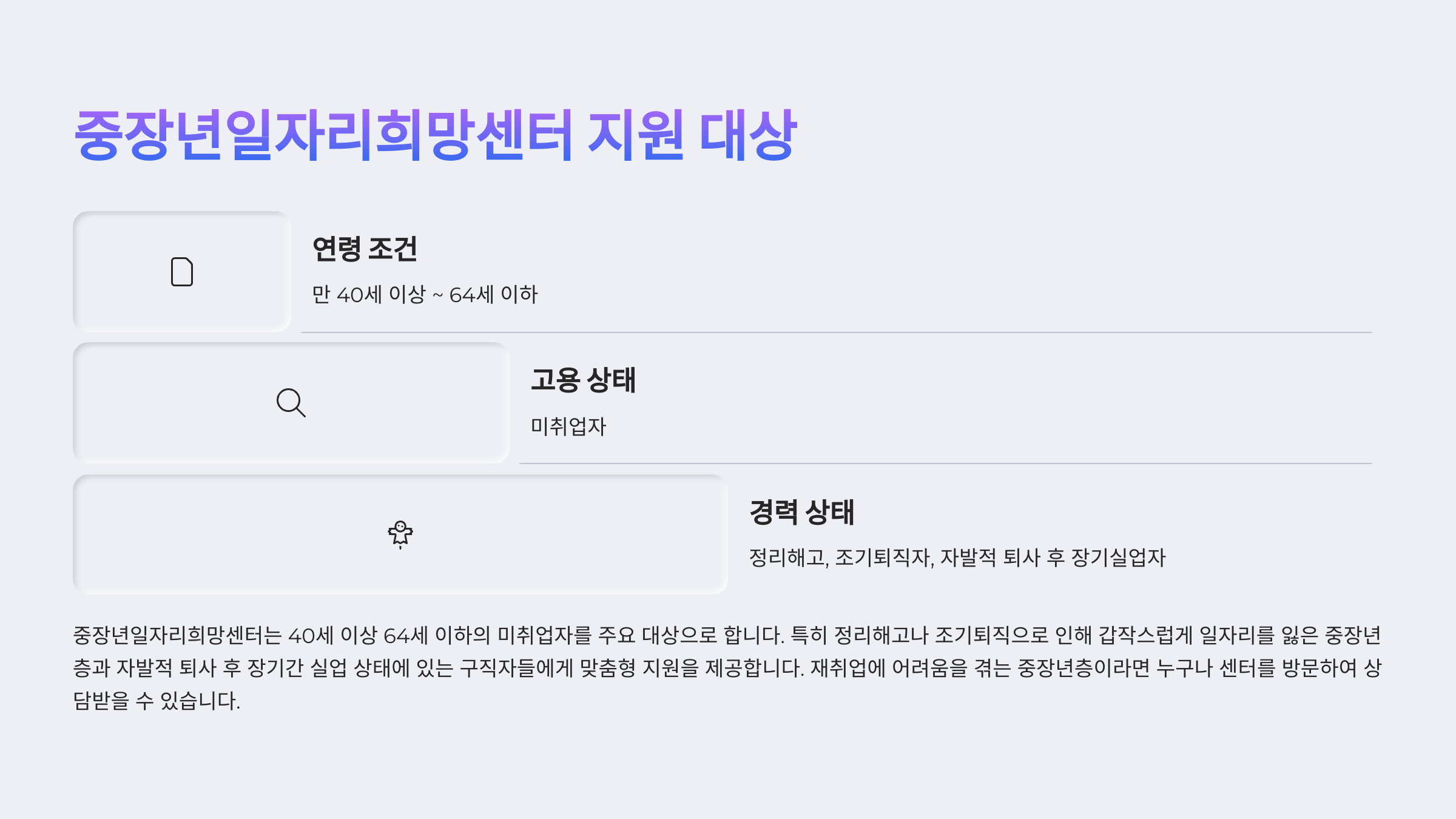 고용노동부와 한국노인인력개발원이 운영하는 중장년일자리희망센터는 40~60대 실직자 대상 상담·교육·취업연계 + 소득지원을 복합적으로 제공합니다. 일부 센터는 면접준비비, 직업훈련참여수당, 생활비 지원도 병행 중입니다.