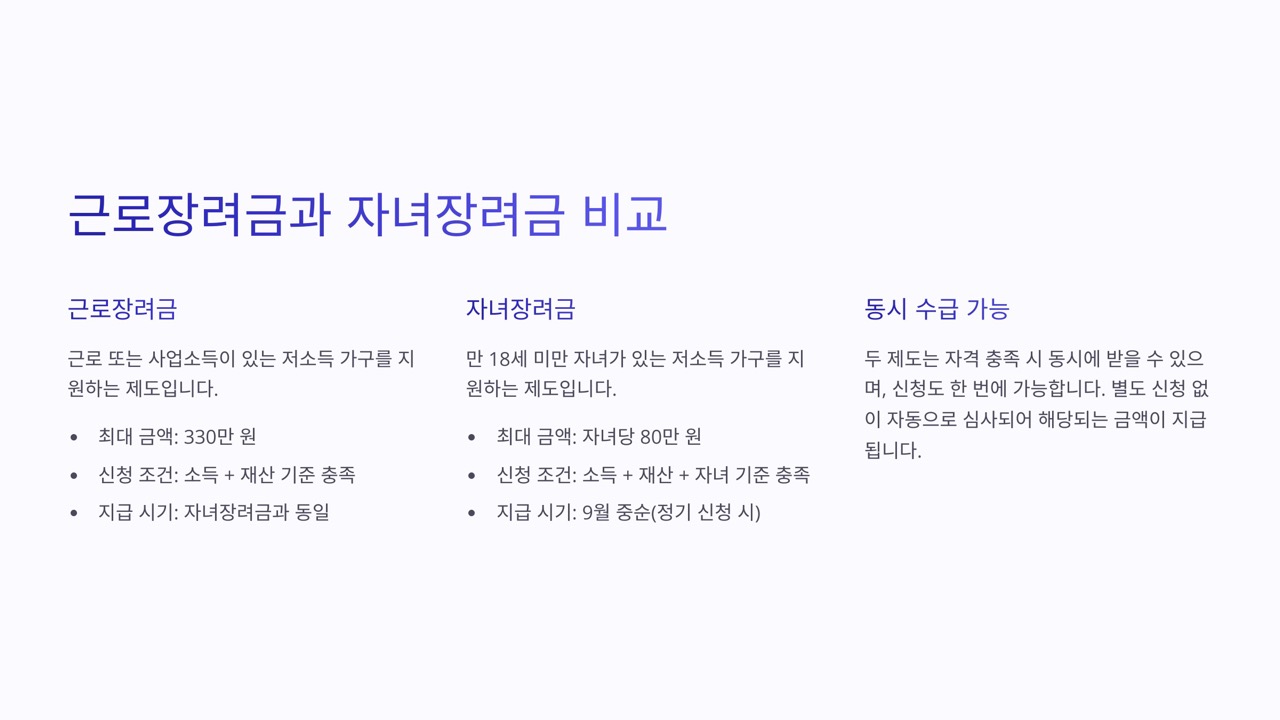 - 자격 충족 시 근로장려금과 자녀장려금은 동시에 지급