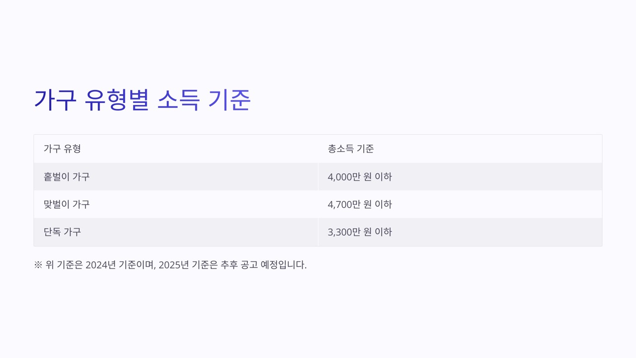 | 신청 조건 | 소득 + 재산 | 소득 + 자녀 |