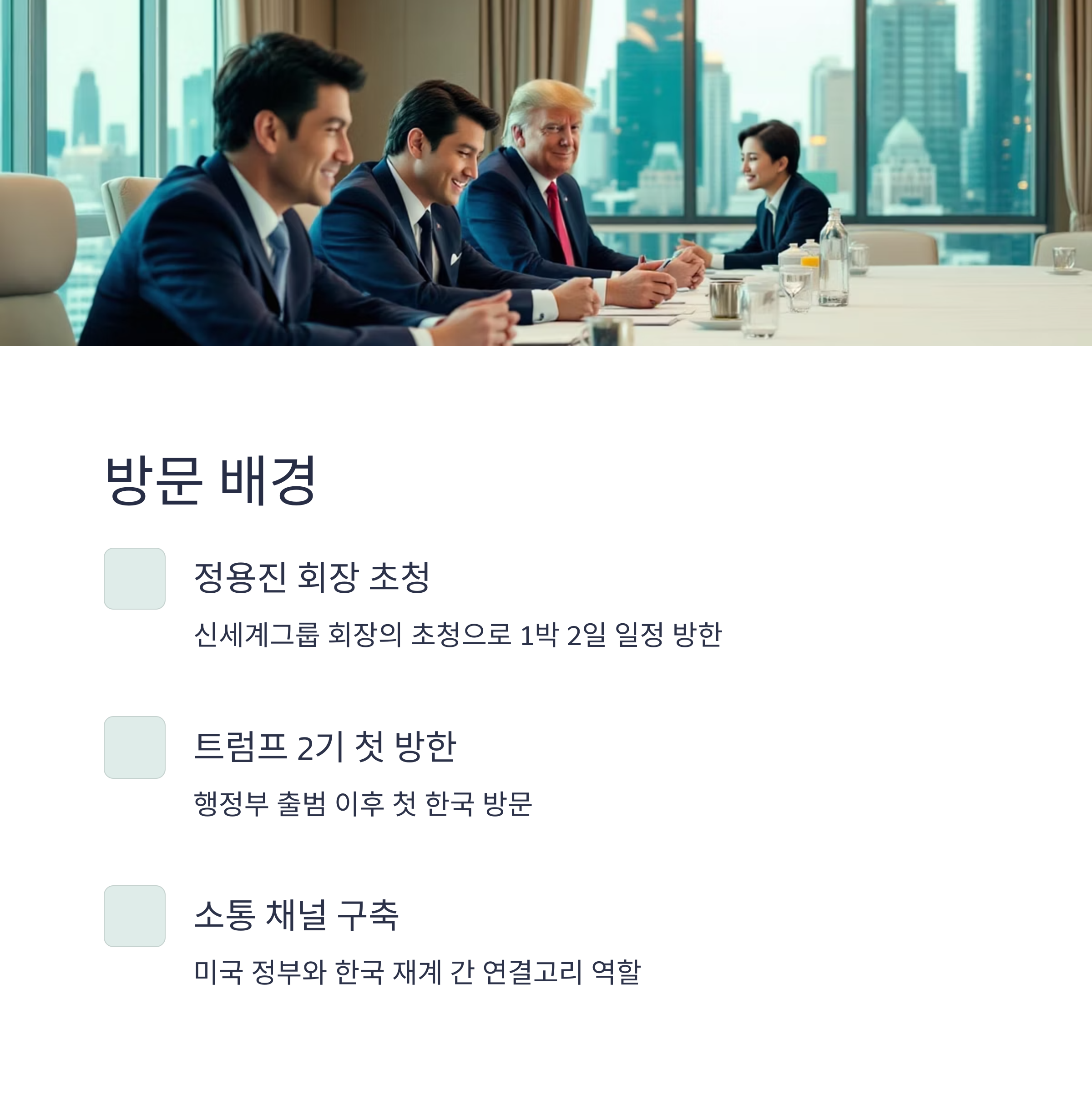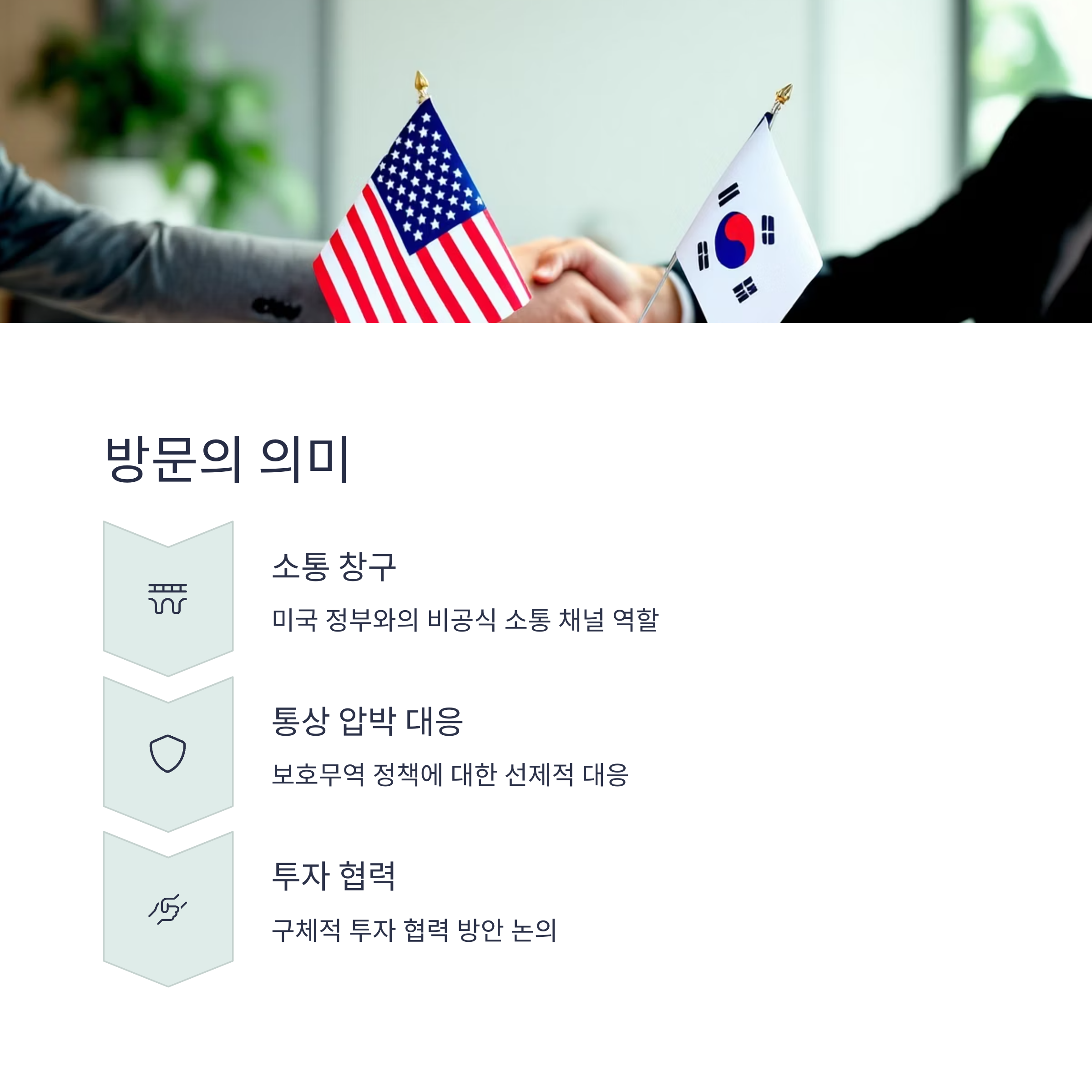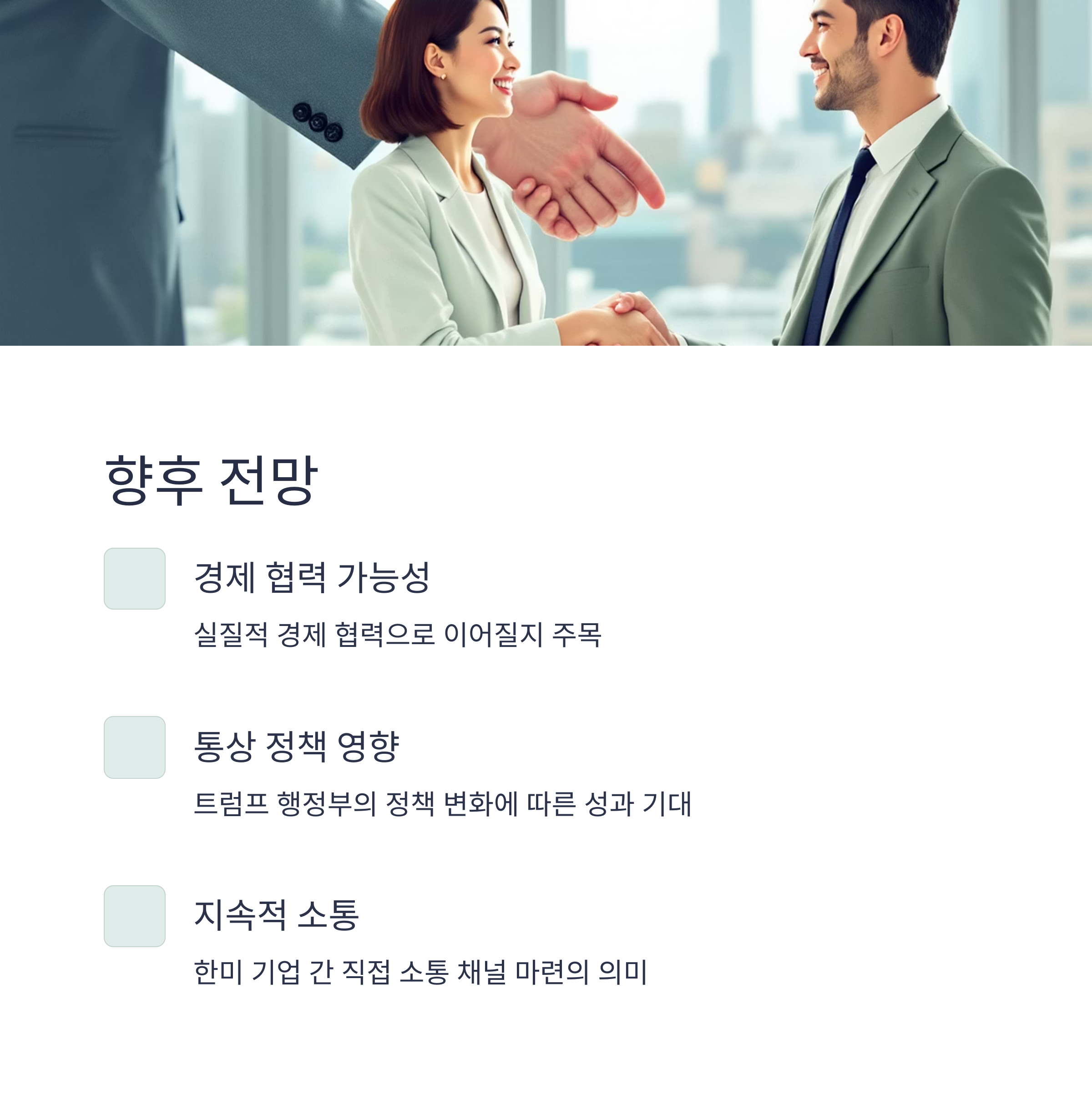 이번 방한이 실질적인 경제 협력으로 이어질지는 아직 미지수이지만, 미국 트럼프 행정부와 한국 기업 간의 직접적인 소통 채널이 마련되었다는 점에서 의미가 있습니다. 향후 트럼프 행정부의 통상 정책 변화에 따라 이번 만남이 어떤 실질적 성과로 이어질지 주목됩니다.