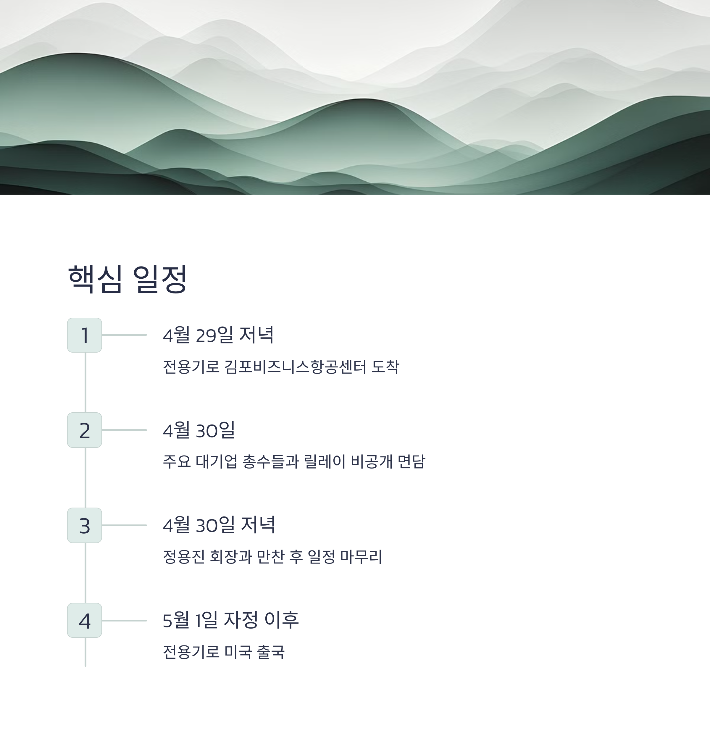 방한 핵심 일정은 4월 30일 하루 동안 진행된 국내 주요 대기업 총수들과의 릴레이 면담이었습니다. 각 기업 총수들은 개별적으로 30분에서 1시간 정도 트럼프 주니어와 비공개 만남을 가졌습니다.