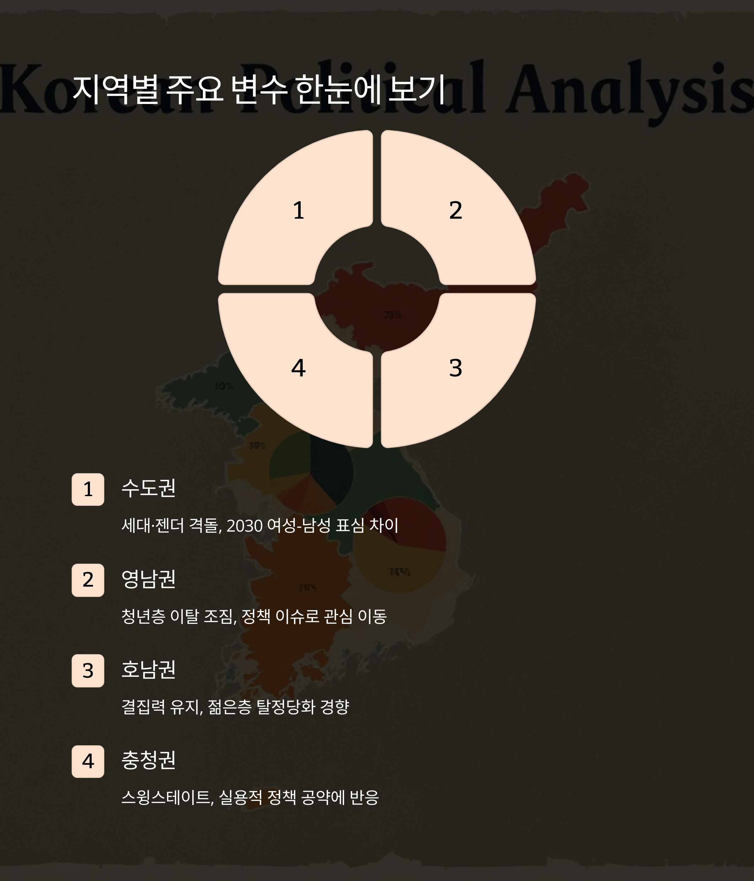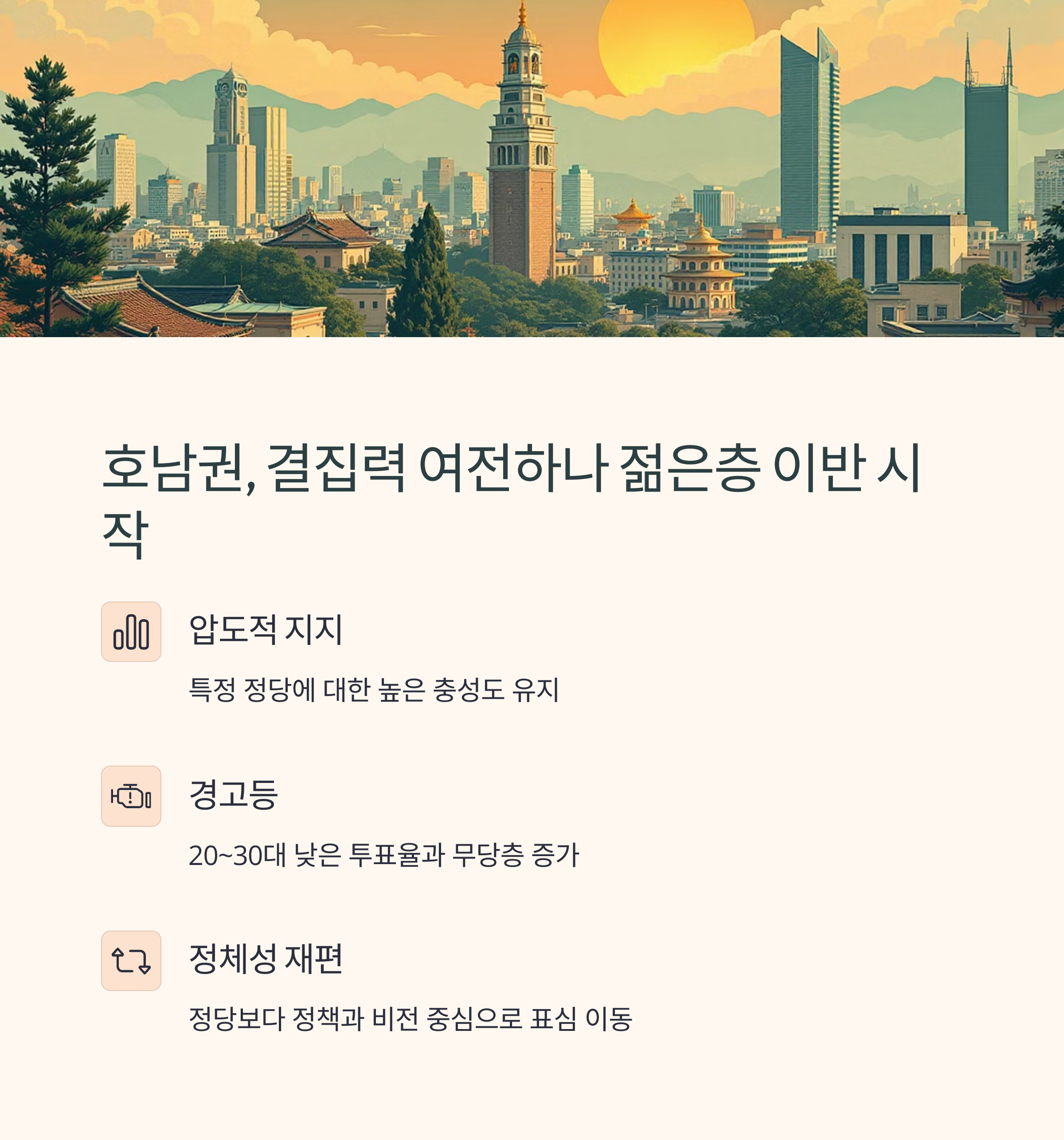 | 호남권 | 결집력 유지, 그러나 무당층 증가 | 젊은층 정치 탈정당화 경향 |