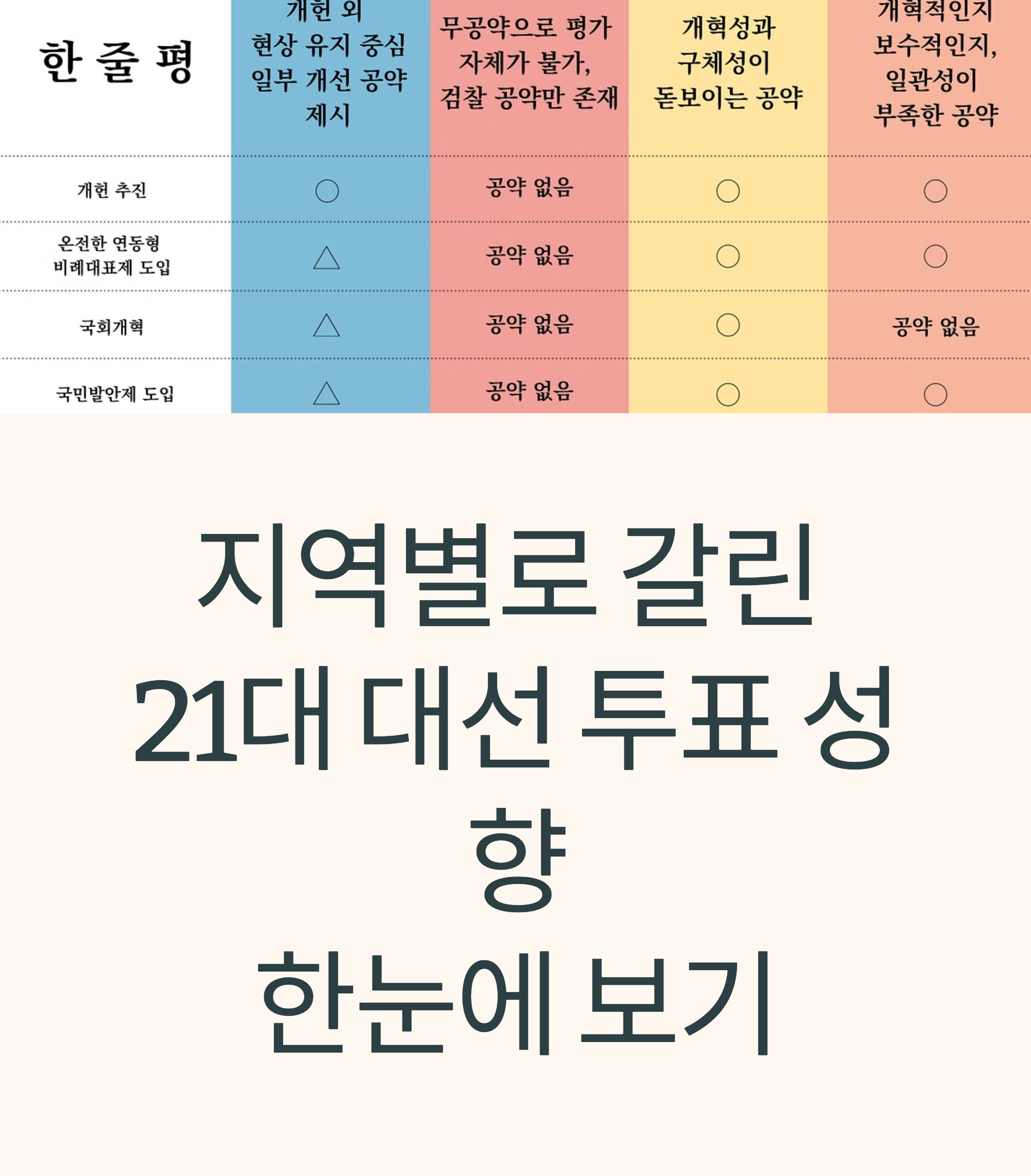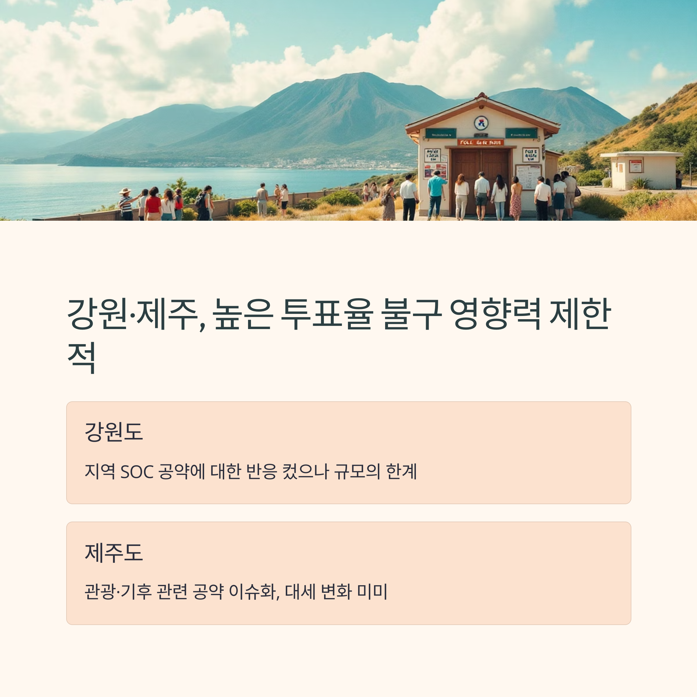 | 강원·제주 | 높은 투표율, 낮은 판도 영향력 | 지역 맞춤 공약 선호 |